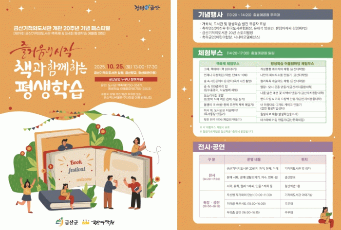 또한, 제19회 도서관 책축제 및 제4회 평생학습 어울림 마당 전시·체험부스가 운영돼 금산기적의도서관 20년의 과거·현재·미래를 보여주고 금산군 평생학습 결과물을 선보인다.