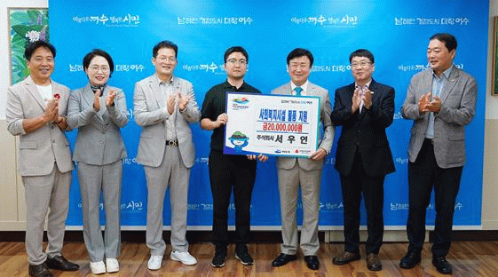 이날 후원증서 전달식은 여수시장실에서 열렸으며, 정기명 시장을 비롯해 장충환 ㈜서우인 대표, 박종철 ㈜한국이씨엔이크리너 대표, 민덕희 시의원 등이 참석해 따뜻한 나눔의 뜻을 함께했다.