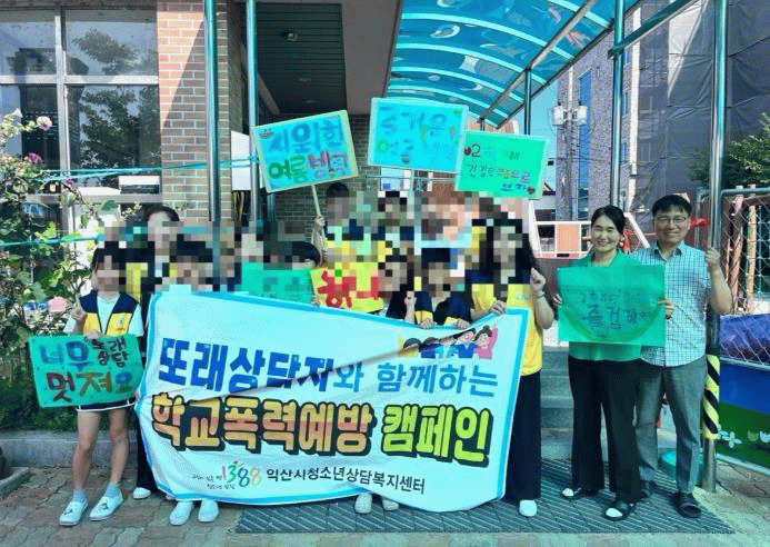 캠페인에는 익산시청소년상담복지센터에서 학교지원단으로 활동하고 있는 교장 2명과 교내 또래상담자 20여 명, 학생회 20여 명이 참여했다.