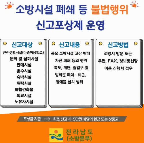 신고는 국민신문고 또는 나주소방서 누리집을 통해 접수할 수 있으며 신고가 접수되면 관할 소방서에서 현장확인 및 행정처분 절차를 진행하고 신고자에게는 관련 규정에 따라 포상금이 지급된다.