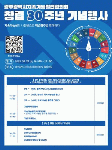 정현윤 기후환경국장은 “광주지속가능발전협의회 30주년 기념행사는 광주시가 지속가능한 미래를 향한 의지를 다지는 중요한 자리”라며 “많은 시민들이 관심을 갖고 적극 참여해 주길 바란다”고 말했다.
