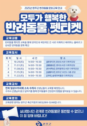 반려동물 문화교육 관련 문의는 완주군청 축산지원과로 하면 되며, 실내 교육 특성상 반려동물과의 동반 입장은 제한된다.