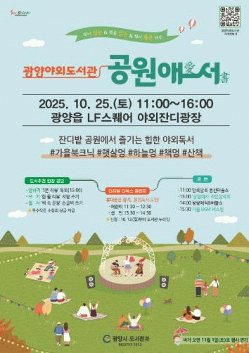 김현숙 광양시 도서관과장은 “『광양 야외도서관–공원애愛서書』는 도서관이 시민과 어떻게 더 가까워질 수 있는지를 보여주는 상징적인 시도”라며 “책이 삶의 한가운데 자리하고, 시민이 도서관과 함께 성장하며 서로의 일상 속으로 스미는 도시를 만들어 가겠다. 깊어가는 독서의 계절, 책과 사람, 자연이 함께하는 이번 특별한 야외도서관 행사에 많은 시민이 참여하길 기대한다”고 말했다.