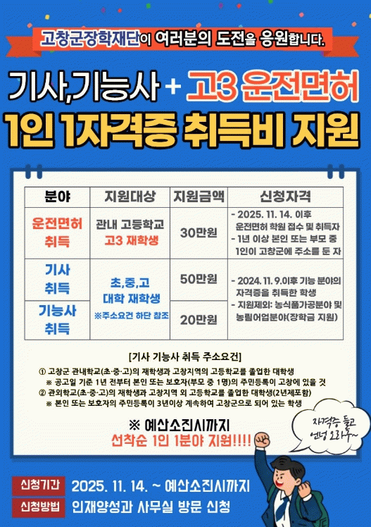 재단에서는 고창군 홈페이지에 공고해 2025년 고창군 장학재단 장학생 선발(4개 분야)과 ‘1인 1자격증 취득비용 지원사업’을 추진한다.