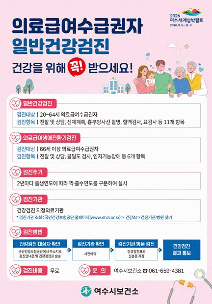 검진은 전국 지정 의료기관 어디서나 가능하며 국민건강보험공단 누리집 및 콜센터 또는 여수시보건소를 통해 지정의료기관과 검진 대상 여부를 확인할 수 있다.