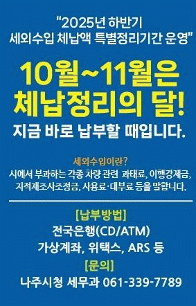 나주시는 이번 정리 기간 세외수입 체납액을 집중적으로 관리하고 성실 납부자와의 형평성을 높이기 위한 자진 납부 독려와 맞춤형 체납 관리에 주력한다고 24일 밝혔다.