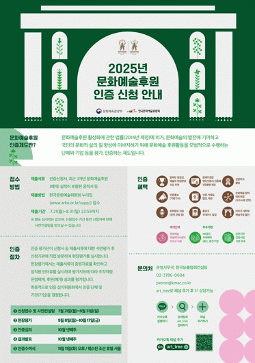 문화예술후원 인증 제도는 문화예술 후원 활성화를 위해 모범적인 후원활동을 수행하는 단체와 기업 등을 평가·인정하는 제도로, ▲조직역량 ▲후원 매개프로그램 개발 및 후원 유치 전략 ▲후원 성과 등의 활동 역량을 종합 평가해 선정한다.