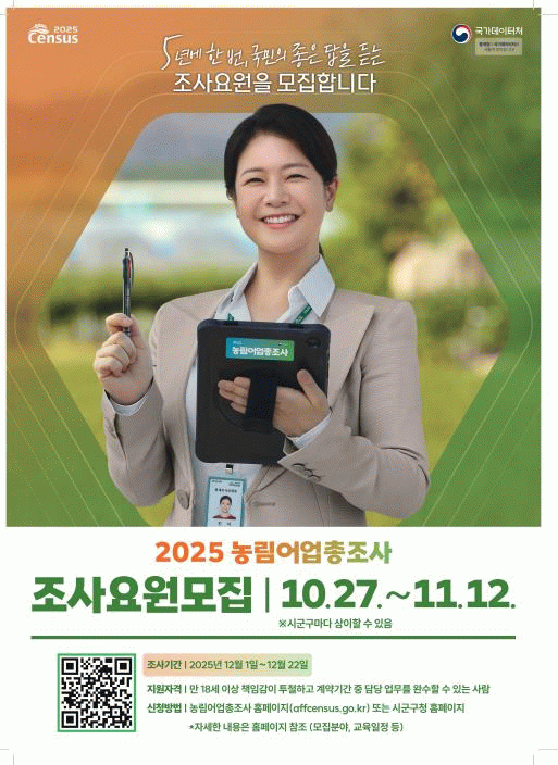 최훈식 장수군수는 “농림어업총조사는 농산어촌의 현실을 객관적으로 진단하고, 이를 바탕으로 지역 맞춤형 정책을 설계하기 위한 중요한 국가 통계사업”이라며 “조사의 성공은 조사요원의 꼼꼼한 조사와 주민의 협조에 달려있는 만큼, 지역 발전에 관심 있는 분들의 적극적인 참여를 부탁드린다”고 말했다.