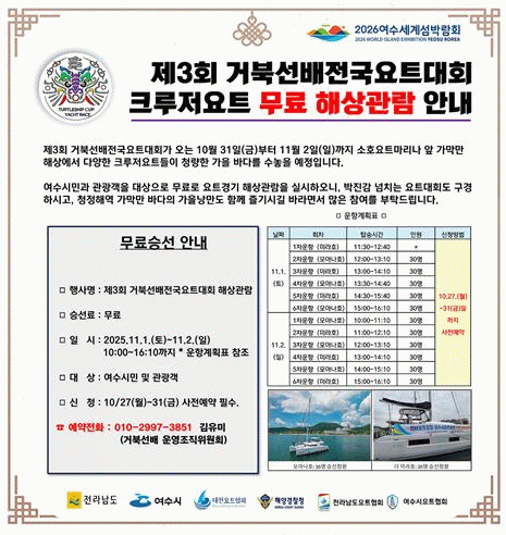 시 관계자는 “해상경기 관람정을 타고 청정 해역 가막만을 배경으로 펼쳐지는 생동적인 요트경기의 묘미를 느끼며 섬과 바다가 아름다운 여수의 가을 바다를 마음껏 즐기시길 바란다”고 말했다.