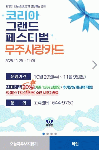 ’코리아 그랜드 페스티벌‘은 산업통상부와 중소벤처기업부 등 정부 부처가 공동 주관하는 국가 단위 대규모 할인행사로, 행사 기간 중 페스티벌 기간에 무주사랑상품권을 구매하면 15% 선할인에 더해, 추가 5% 캐시백이 추가로 적립된다.