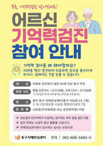 이를 위해 오는 11월 말까지 치매안심센터 전문 인력이 경로당, 노인복지시설, 종교시설 등을 직접 찾아가 치매 선별검사를 무료로 실시한다.