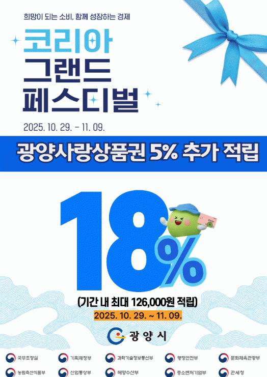 정해종 투자경제과장은 “이번 광양사랑상품권 특별할인은 시민들의 소비 심리를 회복시키고 지역 상권에 활력을 불어넣는 계기가 될 것”이라며 “코리아 그랜드 페스티벌 기간 상품권을 적극 활용해 지역경제 활성화에 함께해 주시길 바란다”고 말했다.