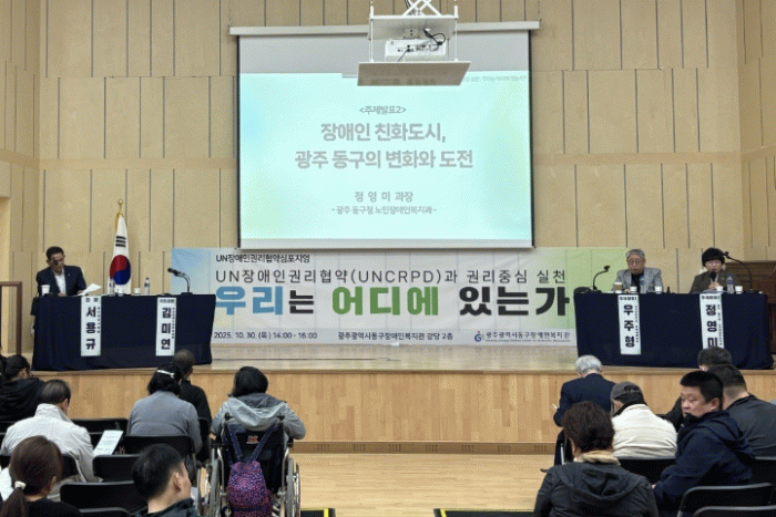 좌장은 서용규 광주광역시의회 부의장이 맡았으며, 김미연 UN 장애인권리위원회 위원장의 기조 강연을 시작으로 우주형 나사렛대학교 휴먼재활학부 교수와 정영미 노인장애인복지과장의 주제 발표 순으로 진행됐다.