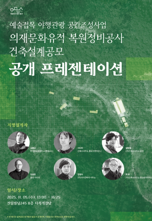 이들은 각각 의재문화유적의 복원 방향, 공간구성, 자연환경과의 조화, 방문객의 체험 동선 등 다양한 해석을 제시할 것으로 보이며, 심사위원과 함께 작품별로 차별성과 실현 가능성, 예술적 완성도 등에 대해 심도 있는 논의도 펼칠 계획이다.
