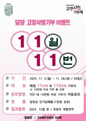본 이벤트는 해당 기간 내 담양군에 10만 원 이상 기부를 하는 경우 자동 응모되며, 매일 11번째와 110번째 기부자에게 1만 원 상당의 담양군 인기 답례품을 증정한다.