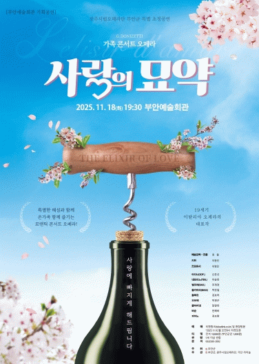 코믹한 연출과 아름다운 선율이 어우러진 이번 공연은 웃음과 감동을 동시에 선사할 뿐만 아니라 출연진으로 소프라노 신은선(아디나 역), 테너 이승민(네모리노 역) 등 실력파 성악가들의 출연으로 더욱 풍성해질 감동과 따뜻함을 느낄 것이다.