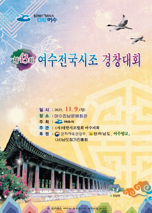 이번 대회는 여수시가 주최하고 (사)대한시조협회 여수지부(대표 송정숙)가 주관하며 우리 고유의 전통 성악 예술인 시조창의 계승·발전과 역량 있는 신인 발굴을 목적으로 추진된다.