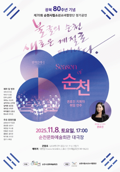 소년소녀합창단원들의 연기와 합창, 영상이 결합된 창작 공연으로 저항의 시간부터 해방의 순간까지를 예술적으로 풀어내며 광복의 의미와 순천의 정신을 새롭게 조명한다.