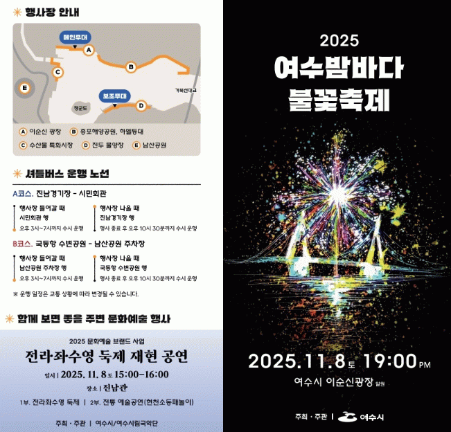 한편 올해 10주년을 맞는 ‘2025 여수밤바다 불꽃축제’는 11월 8일 이순신광장과 장군도 앞 해상 일원에서 진행된다.
