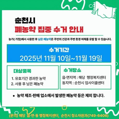 시 관계자는 “폐농약은 부적절하게 보관하거나 방치하면 토양과 수질을 오염시키고, 생태계 및 인체에도 유해한 영향을 미칠 수 있다”며 “이번 집중수거 기간 동안 많은 농가와 시민이 참여해 깨끗하고 안전한 농촌 환경 조성에 동참해 주시기 바란다”고 당부했다.