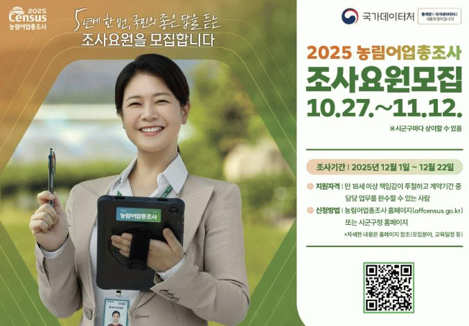 농림어업총조사는 5년마다 실시되는 국가 통계사업으로, 농가·임가·어가의 규모와 경영형태, 구조 변화를 파악해 농림어업 정책 수립과 지역 발전 전략의 기초자료로 활용한다.