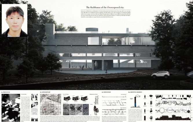 김현준 학생의 작품‘The Bathhouse of the Overexposure City’는 서울 강남구 학동근린공원 내 도심형 공공목욕탕을 제안한 설계로, 현대 도시 속에서 ‘머무름’과 ‘느림’의 건축적 가치를 구현했다.
