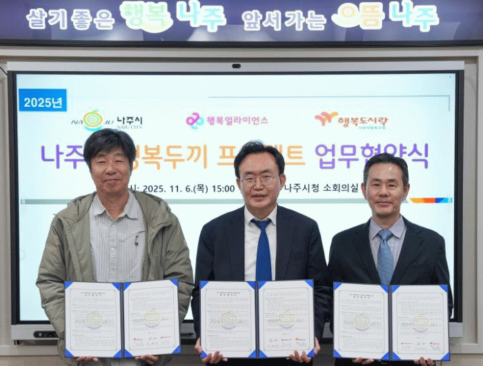 나주시는 6일 오후 시청 소회의실에서 행복나래㈜, 행복도시락사회적협동조합과 함께 ‘행복두끼 프로젝트’ 업무협약을 체결하고 사각지대에 있는 결식 우려 아동의 안정적인 식사 지원을 위한 협력체계 구축에 뜻을 모았다.