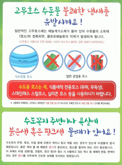 또한 고무호스 자체 냄새는 적지만, 수돗물 속 염소와 반응해 클로로페놀이 생성되면 불쾌한 맛과 냄새를 유발하기도 했다.