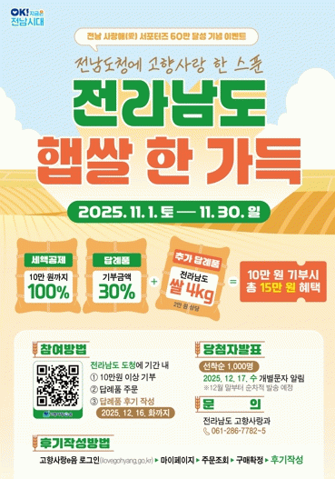 이벤트는 고향에 사랑을 나누고, 지역 농가를 응원하는 분위기 확산을 위해 마련됐다. 11월 1일부터 30일까지 전남도청에 10만 원 이상을 기부하고 답례품 후기를 작성한 선착순 1천 명에게 전남 햅쌀 4kg을 추가로 증정한다.
