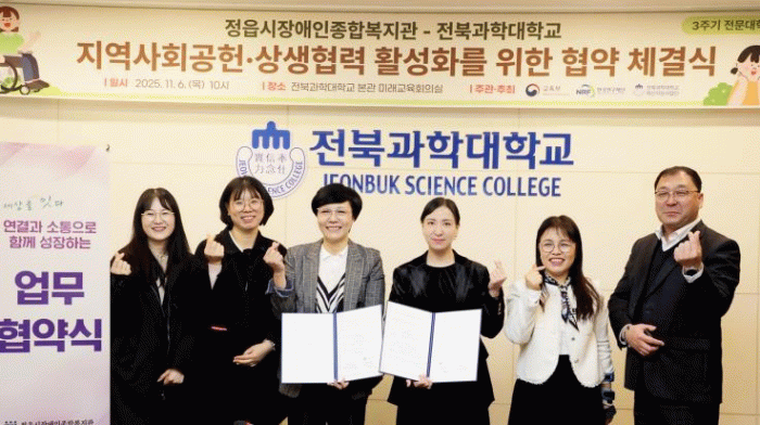 정읍시장애인종합복지관(이하 복지관)은 지난 6일 전북과학대학교 혁신지원사업단과 ‘지속가능한 사회적 가치 실현’을 위한 업무 협약을 맺었다고 10일 밝혔다.