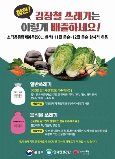각 가정에서는 김장쓰레기가 많이 발생해 음식물 수거용기가 부족한 경우에는 음식물쓰레기 전용봉투(20L, 분홍색)를 사용하거나, 일반쓰레기 소각용 봉투(50L, 흰색)에 담아 배출하면 된다.