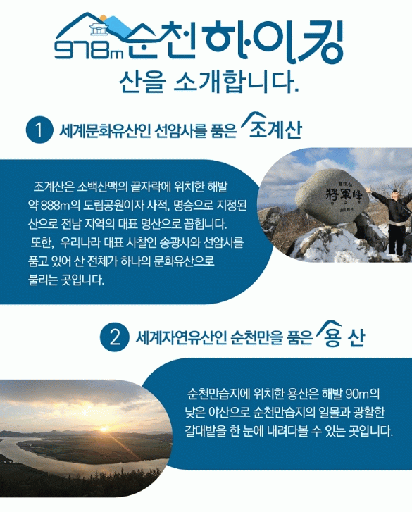 유네스코 세계유산 선암사와 세계자연유산 순천만습지를 연결하는 생태하이킹 챌린지로 조계산(888m)에서 용산전망대(90m)까지 총 978m의 상징적 고도를 따라, 순천의 자연과 문화, 그리고 사람을 하나의 여정으로 엮는다.
