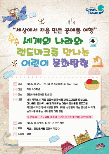 익산시 관계자는 "아이들이 손으로 배우고 눈으로 느끼며 세계의 다양성을 이해하는 시간이 될 것"이라며 "놀이처럼 즐기는 문화여행을 통해 도서관이 더욱 친근한 배움의 공간으로 다가가길 바란다"고 말했다.