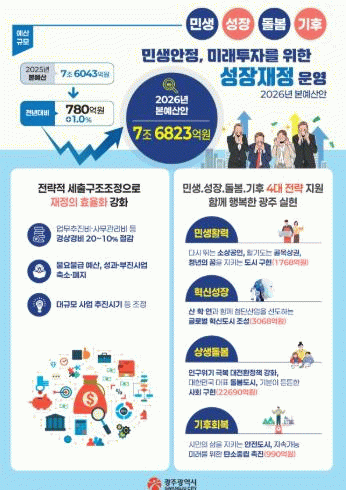 광주시는 특히 ▲민생활력 : 서민경제 안정과 골목상권 재도약 지원 ▲혁신성장 : 미래산업 선도와 글로벌 혁신도시 도약 ▲상생돌봄 : 인구위기 대응과 전 생애주기 복지 실현 ▲기후회복 : 2045 탄소중립과 안전한 도시 구현 등 4대 전략에 중점적으로 투자한다.