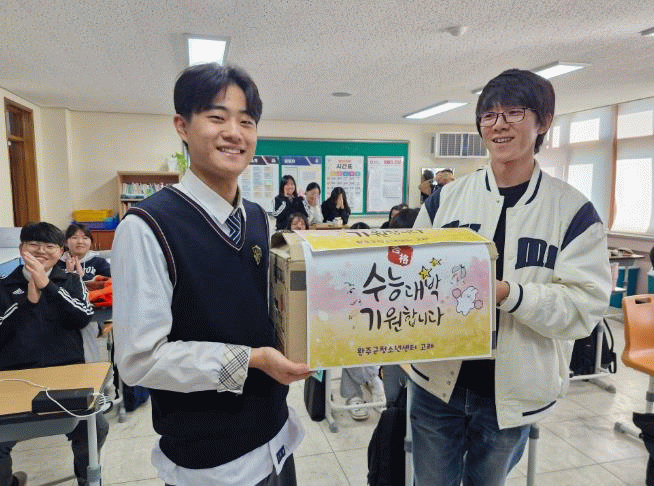 이렇게 정성껏 완성된 간식꾸러미는 11월 10일과 11일 이틀에 걸쳐 고산고등학교, 세인고등학교, 한국게임과학고등학교 3학년 학생들에게 전달됐다.