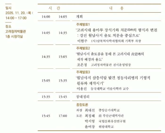 이현주 남북역사학자협의회 차장의 ‘고려시대 용마루 장식기와 치문의 형식과 변천: 강진 월남사지 출토 치문을 중심으로’라는 주제발표를 시작으로 조은정 고려청자박물관 팀장이 ‘월남사지 출토품을 통해 본 고려시대 靑瓷塼의 제작 배경과 용도’이라는 주제로 월남사와 고려청자요지의 연관성에 대한 발표를 이어간다.