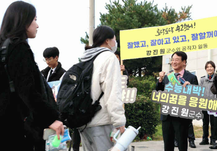 이날 강 군수는 이른 아침부터 현장을 찾아 학부모와 교직원, 군의회, 후배 학생들과 함께 ‘수험생 파이팅!’ 응원 피켓을 들고 수험생들에게 응원의 박수를 보내며 “그동한 흘린 땀과 노력이 결실을 맺는 날이 되길 바란다”며 “여러분이 꿈과 목표를 가지고 노력한다면 군에서도 아낌없이 지원하여 꿈을 실현하는 데 힘이 되겠다”고 말했다.
