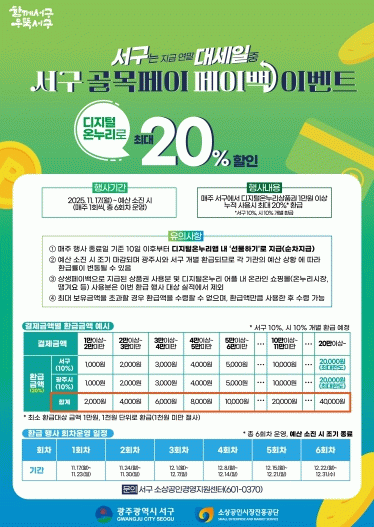 또한 광주광역시의 10% 환급행사와 연계할 경우 소비자는 최대 20% 할인 혜택을 받을 수 있어 전국에서 유일하게 20% 혜택이 유지되는 지방정부가 됐다. 소비자는 서구에서 일주일에 온누리상품권 20만원을 소비하면 4만원을 되돌려받을 수 있으며, 서구는 이번 행사로 약 120억원 규모의 지역경제 파급효과를 기대하고 있다.