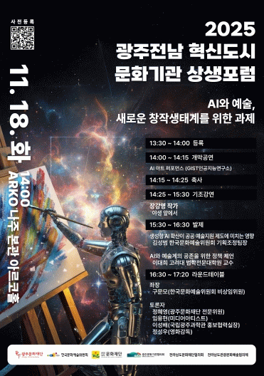 이번 포럼은 AI와 예술의 창작·활용·저작권 등을 중심으로 논의하며, 광주·전남 지역 문화기관 간 상생협력 모델 구축을 목표로 한다. 특히 광주문화기관협의회, 전라남도문화재단협의회, 전라남도관광문화예술협의체가 공동으로 주관해, 지역 문화정책 네트워크의 협력 기반을 확장하는 계기가 될 전망이다.