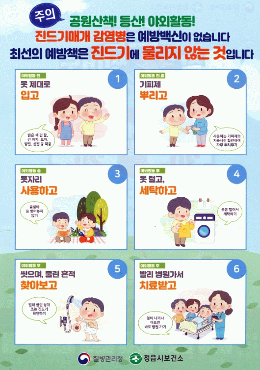 또한 농경지 및 주거지 주변 풀을 제거하고, 풀숲에 옷을 벗어 놓지 않으며 휴식 시 돗자리 사용, 농작업 및 야외 활동 후 작업복 세탁하기, 귀가 즉시 목욕 또는 샤워하기 등 예방 수칙을 준수해야 한다고 강조했다.