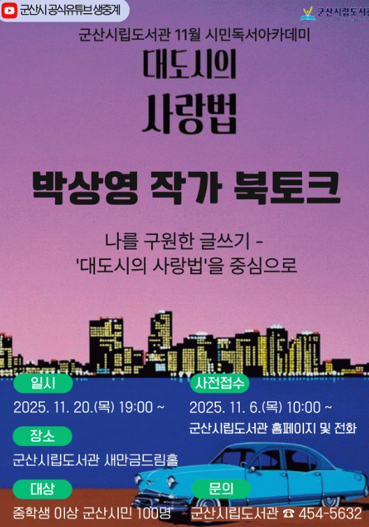 북토크 참여는 중학생 이상 시민 누구나 참여 가능하며, 군산시립도서관 누리집또는 전화로 선착순 100명을 모집한다.