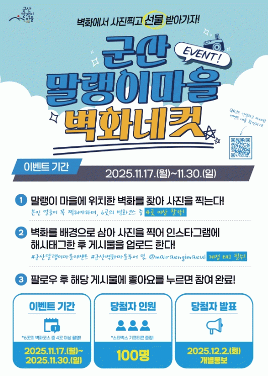 군산시 관계자는 “말랭이마을의 감성적인 골목풍경을 배경으로 한 벽화네컷 행사가 방문객을 중심으로 사회관계망(SNS)에서 활발히 확산되길 기대한다.”라며 “11월 29일 열릴 골목잔치에 많은 시민과 관광객이 함께해주길 바란다.”라고 말했다.