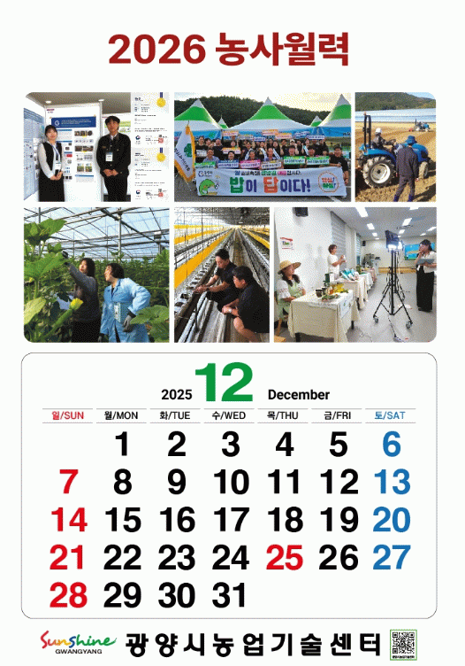 이은희 기술보급과장은 “농사월력을 참고해 영농 일정을 계획하면 시기를 놓치지 않고 체계적으로 한 해 농사를 지을 수 있다”며 “광양시청과 농업기술센터 홈페이지로 연결되는 QR코드도 함께 인쇄돼 있으니 적극 활용해 달라”고 말했다.