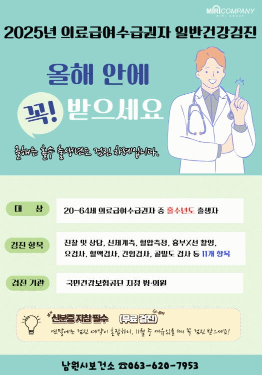 올해 의료급여수급권자 일반건강검진 대상자는 20~64세까지 홀수년도 출생자로, 연말까지 무료 검진 혜택을 놓치지 않도록 조속히 수검할 것을 당부받고 있다.
