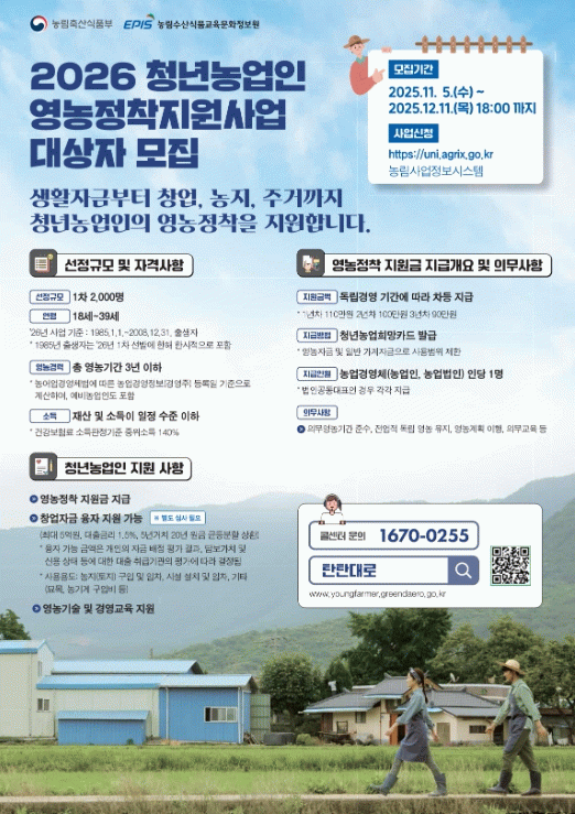 신청은 오는 12월 11일까지 농림사업정보시스템을 통해 온라인으로만 가능하며, 추후 12월 말경에 영농계획서 서면평가와 면접평가를 거쳐 2026년 1월 최종 대상자를 선정할 예정이다.