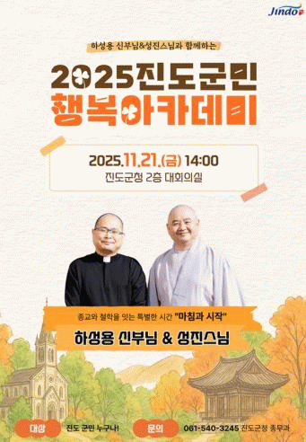 진도군 관계자는 “이번 강연이 군민 여러분께서 잠시 숨을 고르고 자신의 삶을 조용히 돌아보는 시간이 되길 바란다”라며, “서로 다른 길에서 얻은 두 분의 깊은 배움과 성찰이 여러분의 일상에 작은 용기와 위로가 되길 기대한다”라고 말했다.