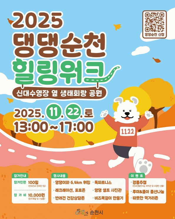 ‘2025 댕댕순천, 힐링워크’ 행사 사전신청은 오는 20일까지 순천시 홈페이지와 SNS를 통해 할 수 있다.
