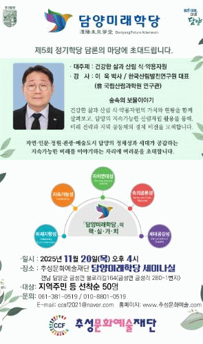 추성문화예술재단 나항도 이사장은 이번 행사를 통해 담양의 인문적 깊이와 생태적 안정성을 되새기고, 세대가 공감하는 자연·인문·정원·관광·예술도시 담양의 정체성과 지속가능성을 모색하는 자리가 될 것으로 기대하고 있다.
