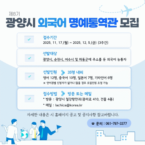 제8기 모집 인원은 총 35명(영어 12명, 중국어 10명, 일본어 7명, 기타 언어 6명) 내외이며, 지원 자격은 광양시를 비롯해 순천·여수·하동 등 인근 지역 거주자 중 외국어 능통자 또는 한국어가 능숙한 외국인이다. 선발된 명예통역관은 2026년 1월부터 2027년 12월까지 2년간 활동한다.
