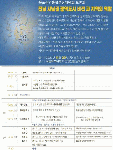 2부 토론은 정기영 세한대 명예교수를 좌장으로 ▲광역도시권 자치단체 협력 방안 ▲서남권 광역도시계획 검토 ▲광역도시화 구상에서 항구도시 목포의 역할 ▲문화·예술 분야의 역할 등 분야별 전문가 의견을 중심으로 심도 있게 진행된다.